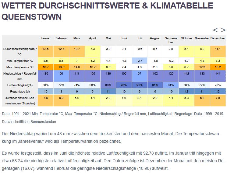 KLIMA für QUEENSTOWN, NEUSEELAND, Quelle climate-data.org